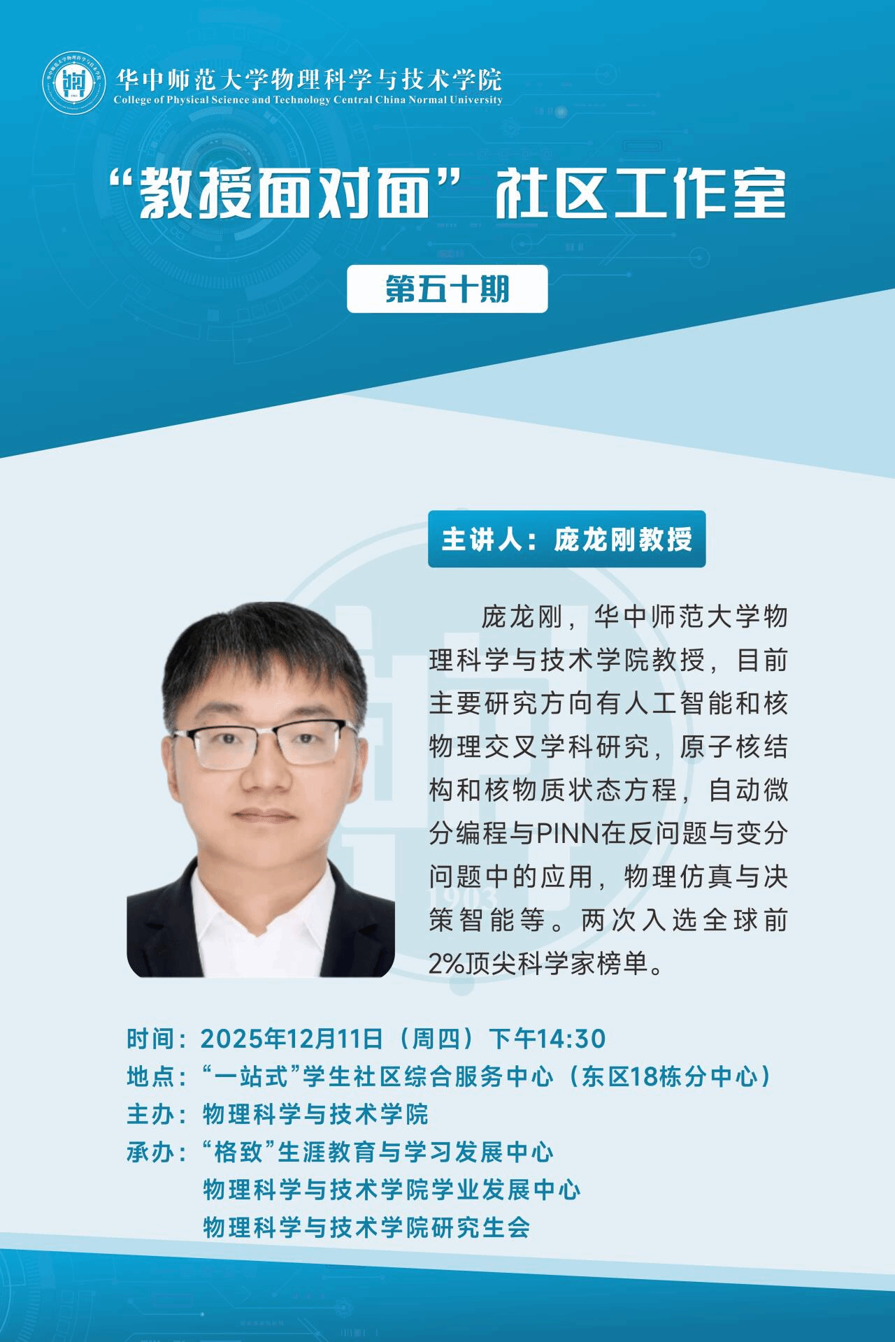 庞龙刚,华中师范大学物理科学与技术学院教授,目前主要研究方向有人工智能和核物理交叉学科研究,原子核结构和核物质状态方程,自动微分编程与PINN在反问题与变分问题中的应用,物理仿真与决策智能等。两次入选全球前2%顶尖科学家榜单。