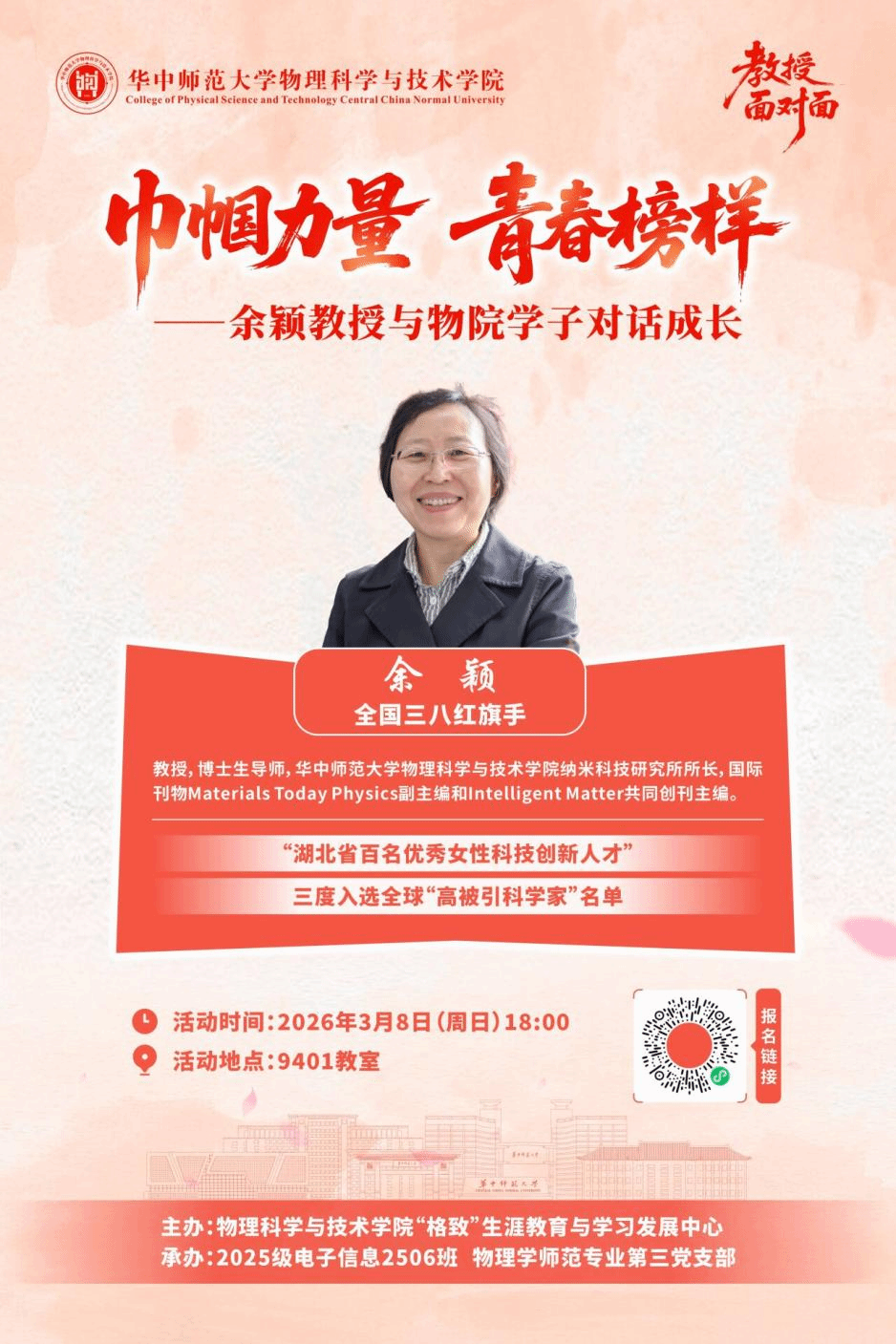 3月8日晚,物理科学与技术学院“教授面对面”之“巾帼力量 青春榜样”主题活动在九号教学楼9401教室举行。全国三八红旗手、学院纳米科技研究所所长余颖教授应邀出席,结合自身成长与科研育人心得,与学子们深入交流,激励大家坚定理想、勇担使命。