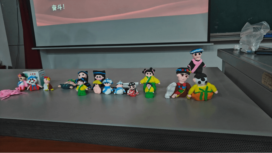 本次活动设置了超轻粘土手工创作环节。全班分为 4-6 个小组,同学们结合此前学到的民族文化知识,根据PPT上的图片,精心设计造型、搭配色彩,在动手创作的过程中加深了对各民族文化特色的理解,也拉近了彼此的距离。