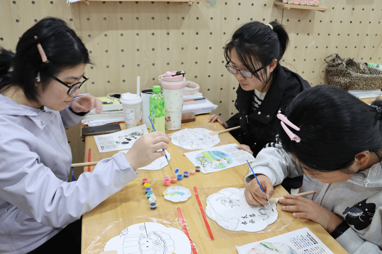 活动现场氛围轻松融洽,各宿舍成员围坐在一起,精心挑选图案、热烈商讨创作思路,创作过程中也互相分享配色方案、提出修改建议,一笔一划细心雕琢作品。一方团扇,既凝聚了同学们的创意与巧思,也成为宿舍成员间沟通审美、增进理解的情感纽带。