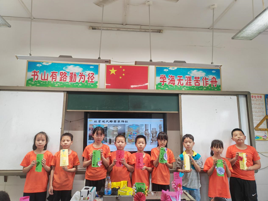 乾坤泱泱华夏,剪纸悠悠指尖。支教队队员逄晓娜为同学们带来了手工之装饰柱,从装饰柱的形状、装饰方法再到装饰柱的经典作品,同学们对装饰柱有了基本的了解。逄晓娜让同学们以小组为单位进行装饰柱的创作,小组中的每位同学负责制作装饰柱的一部分最后组合到一起,同时需要保证每一部分与整体风格的统一性。在小组合作的过程中,同学们相互帮助、勠力同心,积力之所举,共同完成一个作品。最后逄晓娜请每个小组分享装饰柱以及其寓意,同学们积极发言。逄晓娜总结道,在每个小组不同的的作品中能看到孩子们对未来美好的想象。在这节手工课上,同学们用一把剪刀赋予彩纸生命,在剪刀的开合间,感受中华传统艺术的生命和魅力。