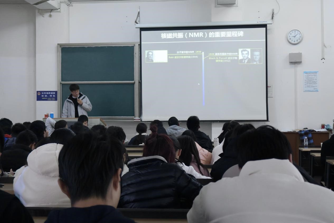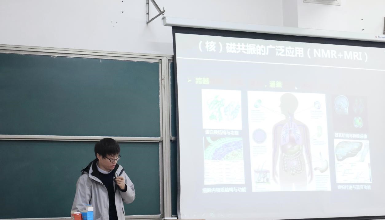 最后,李海东向同学们展示了研究所在核磁共振研究领域的成就:成功研制了两类肺部MRI仪器和人体肺部气体多核磁共振成像装备,为新冠科研攻关提供了重要帮助。同时他也给同学们介绍了中国科学院精密测量科学与技术创新研究所目前的研究方向,对核磁共振未来发展进行展望。