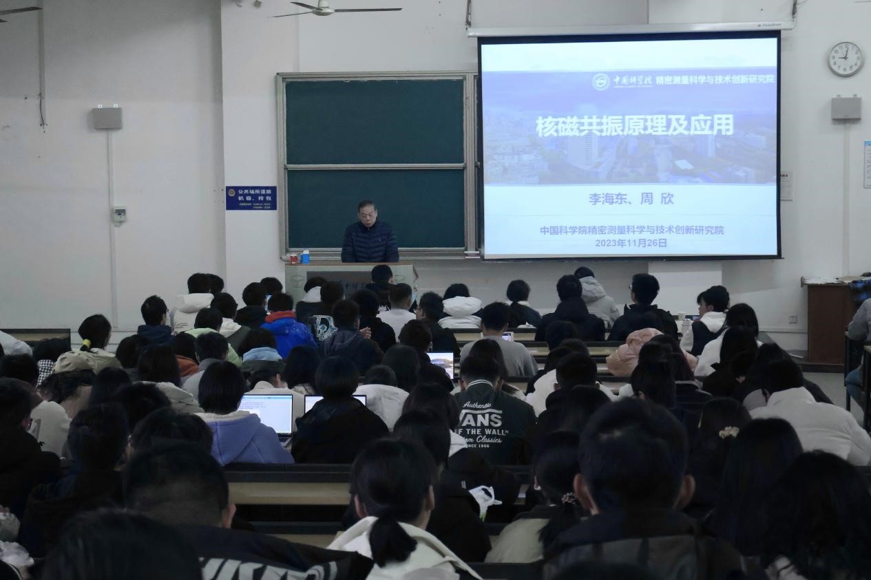 11月26日,学院邀请中国科学院精密测量科学与技术创新研究院李海东研究员在九号楼9401教室开展了主题为“核磁共振原理及其应用”的专题报告。学院副院长吴少平、辅导员严瑞雪及2023级全体同学参与活动,活动由吴少平主持。该报告为学院新生研讨课系列课程之一。