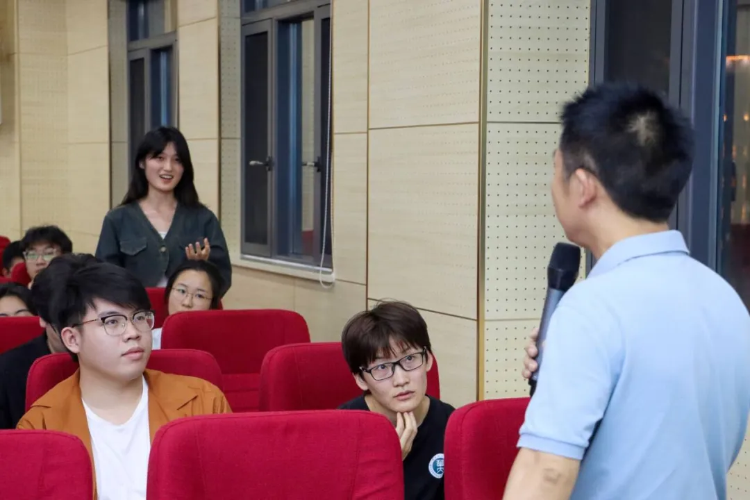 师生交流环节,同学们踊跃提问。针对同学们提出的如何在教学中形成物理脉络的问题,谭坤平强调知识的连贯性和系统性,教师可通过章节框架和“滚动覆盖式作业设计”帮助学生理解和巩固知识;在谈到课程的时代性问题时,谭坤平认为要尝试将物理学上前沿科技成果与日常教学相结合,引导学生理解和应用物理知识;面对同学讲课不自信的问题,谭坤平鼓励同学相信自己的专业能力,并从高一阶段开始逐步过渡,逐渐积累教学经验和自信。谭坤平还向同学们建议,要珍惜实习的机会,通过不断学习和实践展现自己。