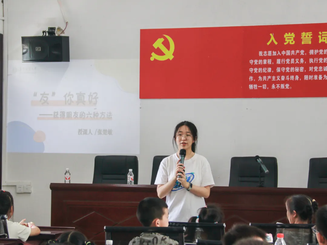 在人际关系小课堂中,实践队队员张楚敏推出了“友”你真好人际交往教学课程,通过一系列生动有趣的互动环节,教给孩子们交朋友的好方法。课堂在儿童歌曲《找朋友》轻松的律动中开场,以“‘友’你真好”通关游戏为主线,孩子们在轻松愉快的氛围中,不仅认识到了交友过程中可能遇到的障碍——“失去朋友的六大方法”,更在老师的引导下,积极探讨并掌握了获得朋友的六种宝贵方法,如微笑待人、学会分享、开玩笑有分寸等。通过友谊许愿树、友谊宣言撰写以及友谊小剧场等互动环节,孩子们不仅表达了自己对友情的渴望与期待,还亲身体验了如何运用所学技巧去结交新朋友,为夏令营的友谊篇章书写了温馨的第一笔。