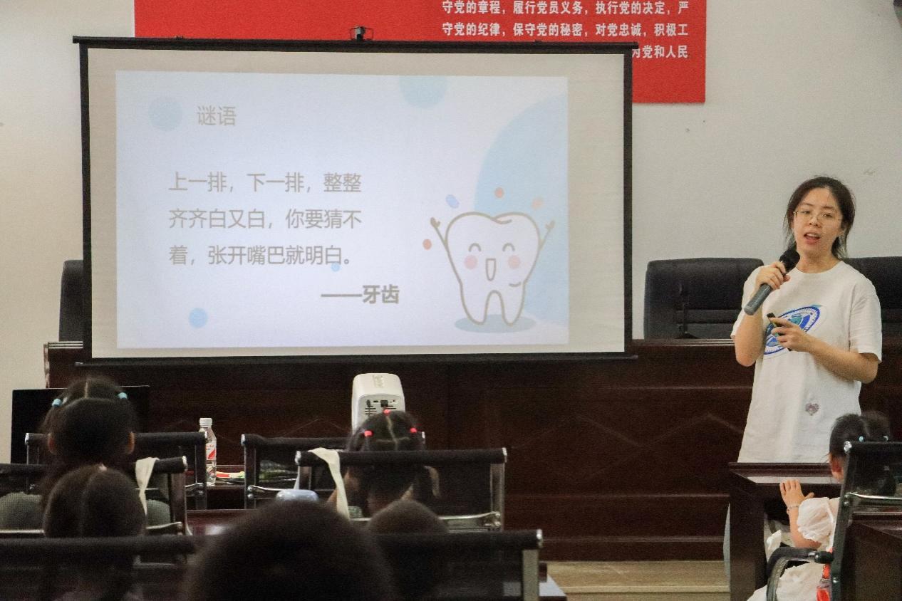 实践队队员吴晨瑜通过一条谜语“上一排,下一排,整整齐齐白又白,你要猜不着,张开嘴巴就明白”引入爱牙课堂。生活中许多行为,如爱吃甜食、不刷牙等都可能伤害到我们的牙齿,孩子们一起观看了蛀牙危害的教学视频,深入地了解了蛀虫对牙齿的侵害。在欢快的“宝宝巴士刷牙歌”中,吴晨瑜给孩子们详细讲解了刷牙的技巧,并为他们科普了儿童与成人刷牙用具和方式等的不同。爱牙护牙习惯的养成,不仅需要学校的卫生教育普及,也需要家庭良好氛围的推动。