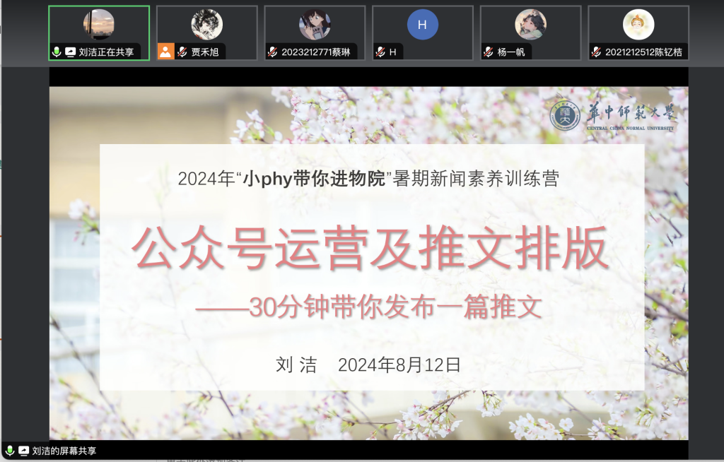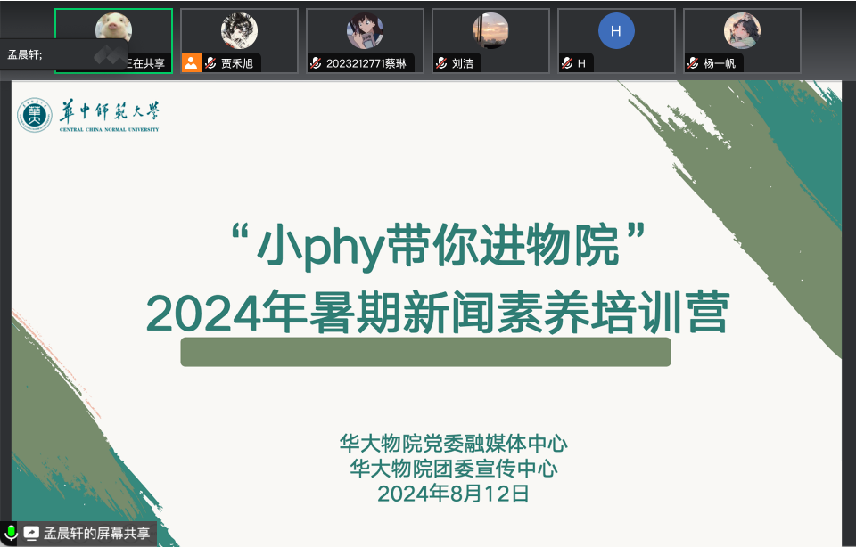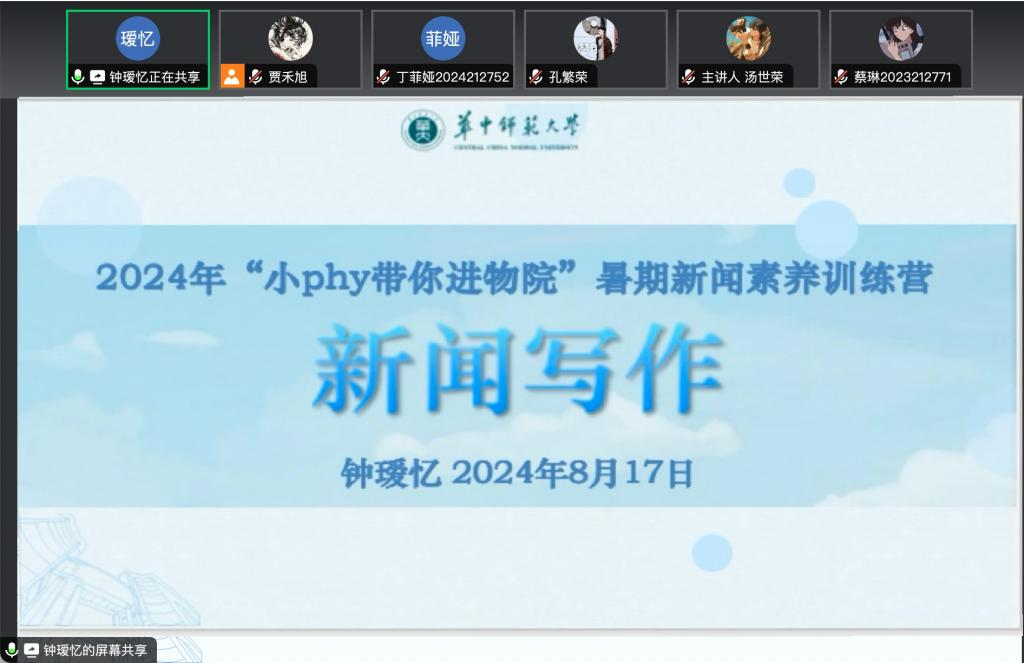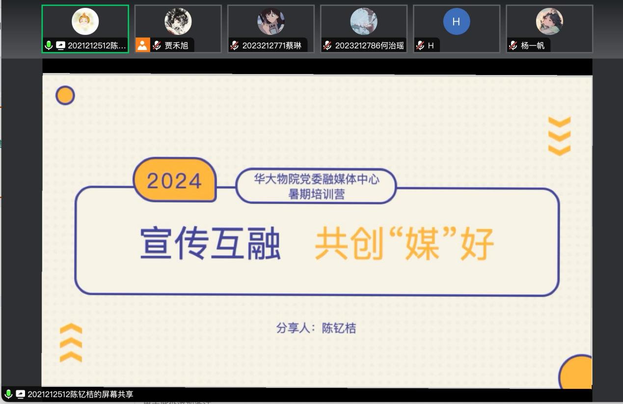 为了充分彰显二级融媒体试点单位的示范引领作用,增进 2024 级新生对学院宣传工作的全方位了解,并为学院宣传工作队伍储备后续力量,8月12日,学院开展为期一天的“小 phy 带你进物院”2024 年暑期新闻素养培训营活动。本次培训营活动通过线上形式开展,参与培训人员共计20人,学院党委融媒体中心及团委宣传中心骨干成员担任课程主讲人,学院宣传干事王棣参与本次活动。