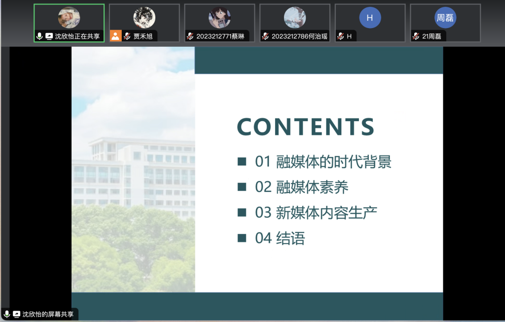华大融媒学生记者团团长陈钇桔以“宣传互融  共创‘媒’好”为主题,从平台、队伍、内容三方面分享了“融媒体融什么?”,并讲述了自身宣传工作经历,一次次紧张刺激的与时间赛跑,一遍遍推翻重来的细致打磨最终成就一篇合格的推文。陈钇桔希望每一位想要成为宣传工作者的同学都能够团结协作,认真负责,传播物院之声。
