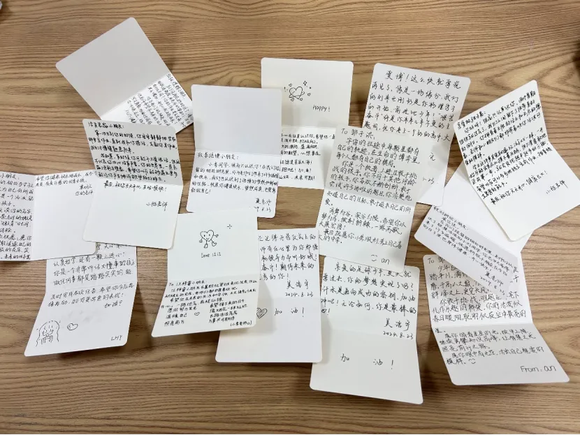 实践队队员们精心准备了亲手书写的祝福贺卡,赠送给每一位参与科普活动的小朋友。小朋友们也用彩笔画下在他们自己心中实践队队员们的模样,表达对实践队队员们的感激与不舍。