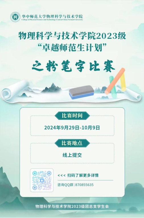 9月29日至10月9日,我院2023级本科生特举办“卓越师范生计划”之粉笔字书法比赛,以期通过竞赛的形式激励同学们在日常中加强师范生技能训练,从而促进综合素质和教育教学能力的提升。