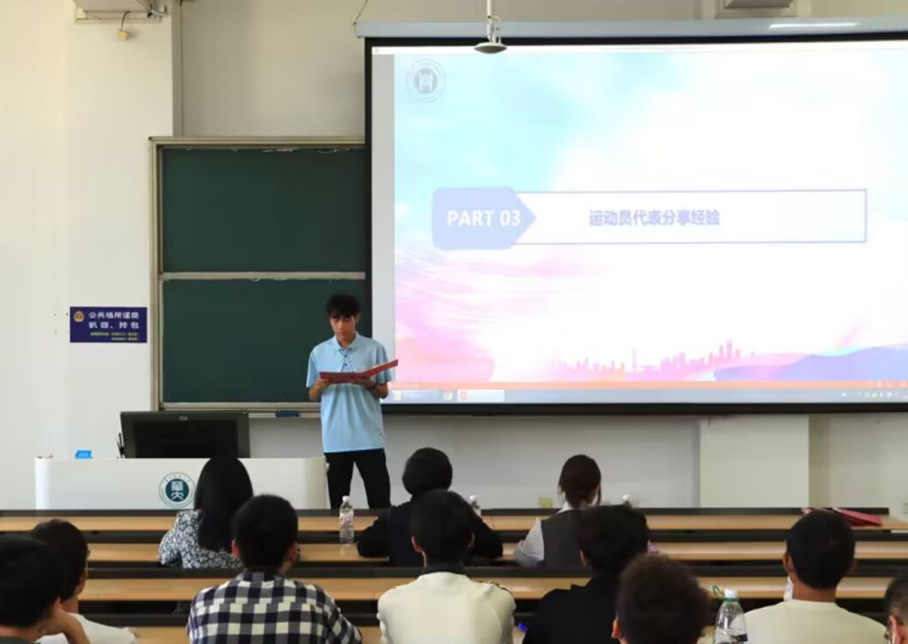 运动员代表毛旭翔分享了个人比赛经历与参赛经验。他提到,今年是他第三次踏上校运会的征程,他以自身经历鼓励同学们在不误学业的同时加强体育锻炼,强调体育锻炼在大学生全面发展中的重要性。同时他向我院运动员提出三点建议,即“健康为基”,“心态为王”,“热爱至上”。