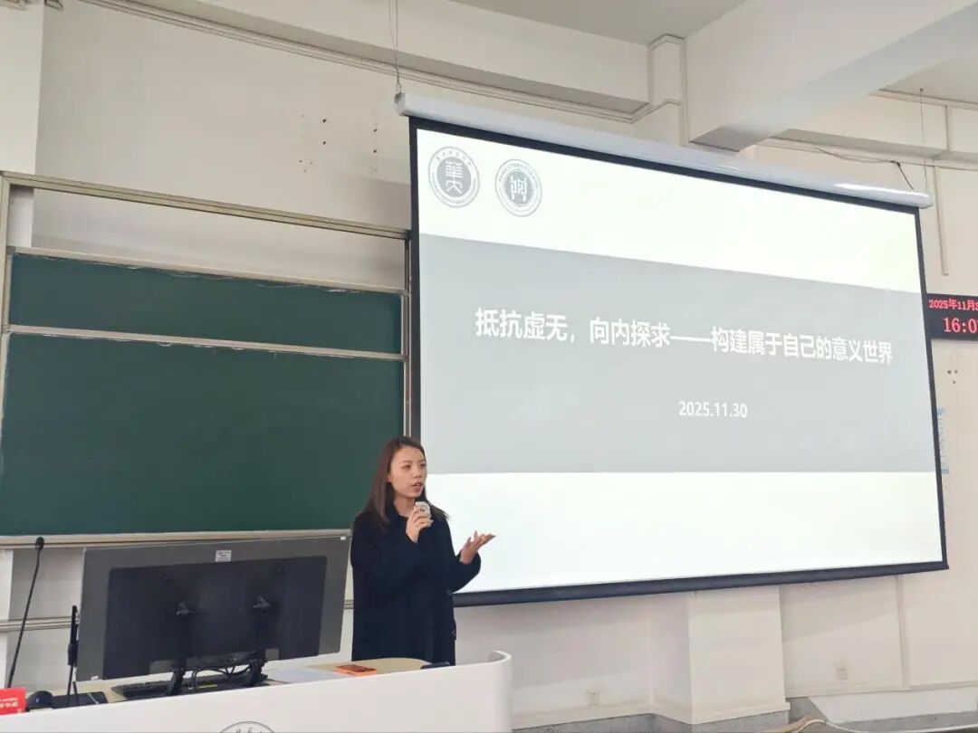 为帮助2024级学生调整心态、明确发展方向,11月30日,学院2024级物理学师范、基地班在 9401 教室开展以 “抵抗虚无,向内探求 —— 构建属于自己的意义世界” 为主题的晚点名活动。活动由辅导员舒佳欣主讲,为同学们破解成长困惑,助力大家在大学阶段找准自我定位。