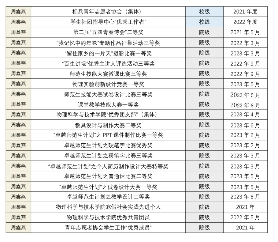 周鑫燕曾任学校学生社团指导中心副部长和物理科学与技术学院青年志愿者协会副会长。她多次组织管理过我院志愿者活动,一直用自己的力量推动物院志愿者活动的发展。周鑫燕还积极参与学科相关的竞赛,在不断的探索与磨砺中逐渐成长,获得了第十四届“格致杯”物理师范生教学技能展示全国一等奖、大学生物理实验竞赛全国一等奖的好成绩,连续三年获校“三好学生”称号,获得了多个奖学金奖励。