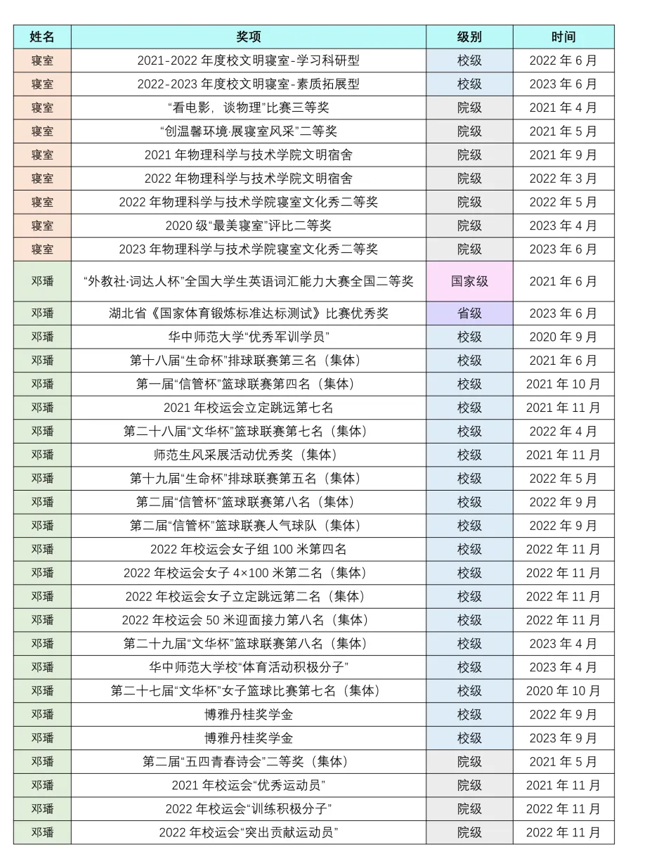 邓璠的大学四年也是收获颇丰。她现任学院师范专业本科生第一党支部宣传委员。在学习生活中,邓璠不仅认真完成好课业任务,还多方面发展,在体育运动上焕发光彩。她的名字多次出现在校运会物院运动员的名单上,曾参加“信管杯”“文华杯”篮球联赛,都取得了优异的成绩。她曾担任物理科学与技术学院女子篮球队队长,获得过校运会女子4×100米银牌。体育运动为邓璠带来了无限生机,她在日常生活中也是活力满满,有动力和精神去做好关于自己的每一件事,并最终得到属于她的嘉奖:她曾获得过两次博雅丹桂奖学金,曾获校“三好学生”、校“体育活动积极分子”、校“优秀军训学员”等荣誉称号。