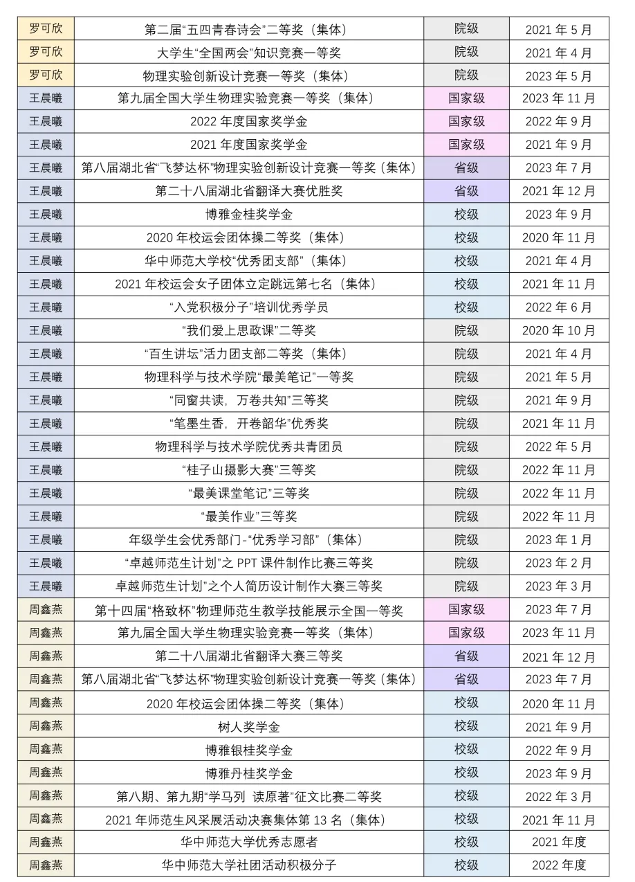 想在漫漫求学路上行稳致远并非易事,但是王晨曦用自己的奋斗去换来了一路的繁花。在数学物理直博班,她从复杂的公式推算与严谨的物理推导的交叉融合中探索,即使大学知识晦涩深奥,也从未熄灭她那一颗满腔热忱的心。王晨曦也曾任2020级团总支学生会学习部长和2005班文体委员,在学生工作中收获成长与进步。日复一日的努力再努力,让王晨曦在学习这一场人生长跑中蓄满能量,不停向前。也正是因为对科学的热爱与对知识的渴求,王晨曦硕果累累:连续三年获得校“三好学生”荣誉称号,获得国家奖学金、博雅银桂奖学金、第九届全国大学生物理实验竞赛一等奖、第28届湖北省翻译大赛优胜奖等多个荣誉奖项。
