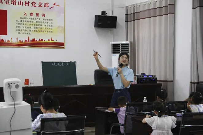 2023年7月,周新颖参加学院党员国情学习与实践队,前往湖北省赤壁市柳山湖镇宝塔山村进行支教实践。作为教学组组长,她根据当地孩子年龄特征和认知水平,与教学组队员一起统筹安排支教课程与特色活动。周新颖将书法特长应用到支教实践,为当地孩子带去书法专题课程,向他们普及了书法基础知识与书法文化。周新颖同时带去“绿色植教”的产品——绿色胶棒,渗透跨学科实践,开展了特色美育课程。周新颖表示,在这次实践经历中,她真真切切地践行了师范生的使命,感受到了青春的价值。