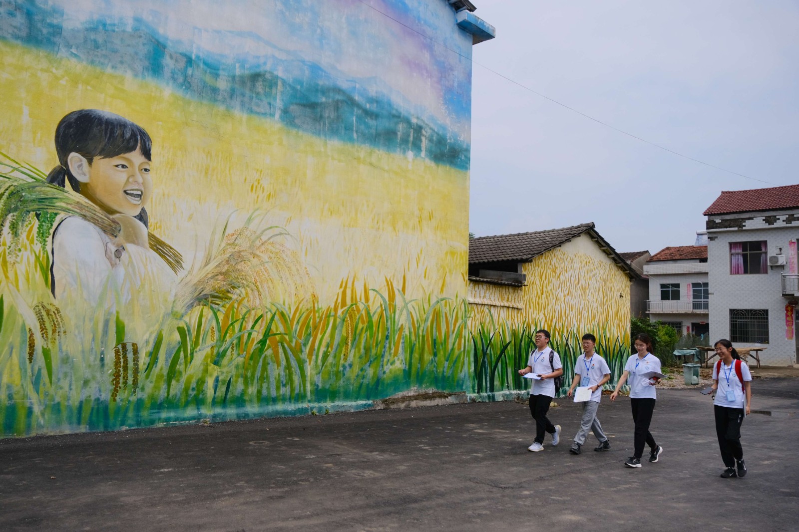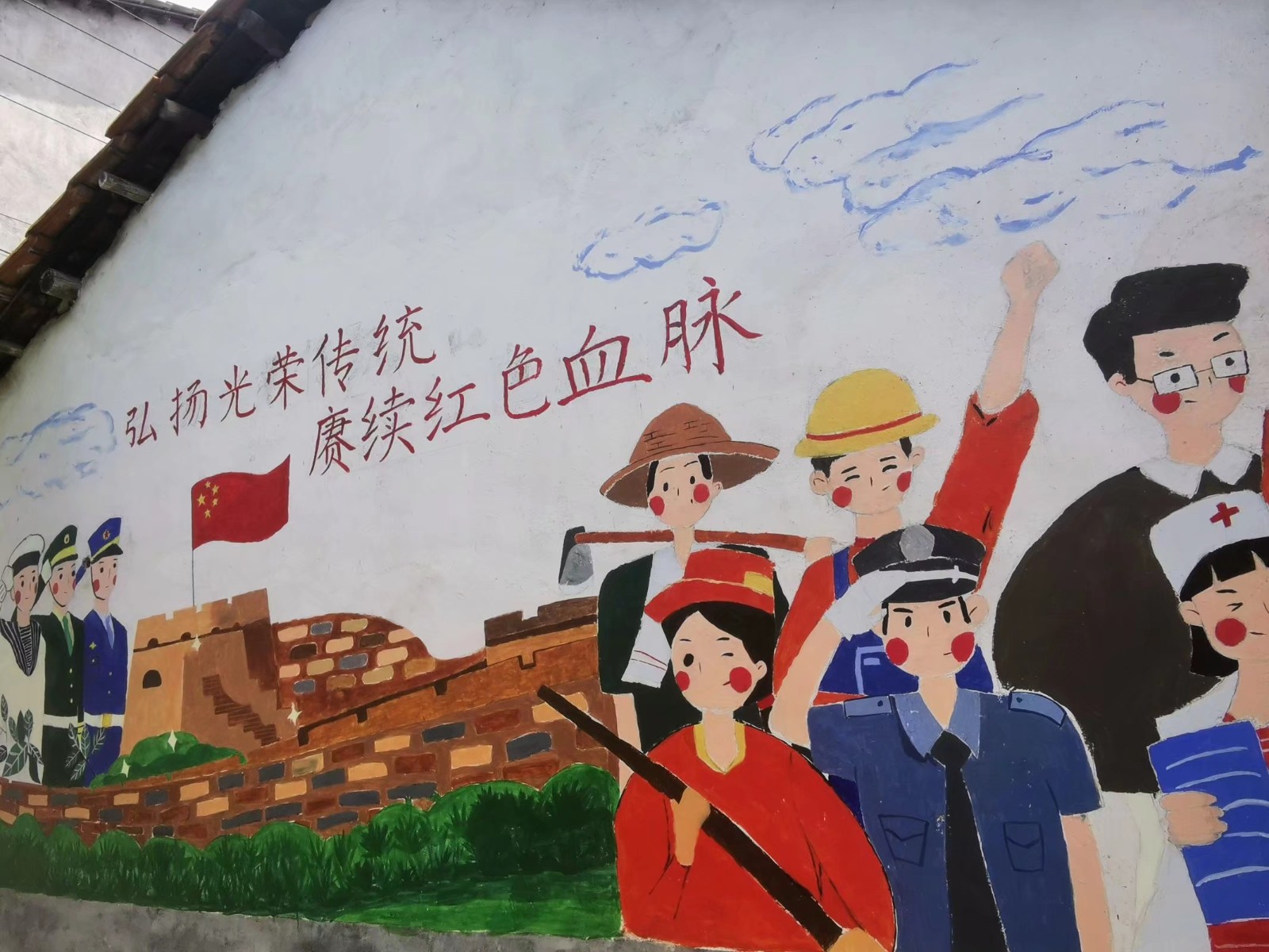 湖北的夏季总是被高温环绕,为避开炎热暴晒的时间段,历届文化墙组队员们总是清晨五点钟就起床开始绘制工作:勾线、调色、填涂……直到接近正午太阳高悬头顶才返回。2021年,文化墙组以“弘扬光荣传统,传承红色精神”为主题,在易家堤村内非交通要道的房屋墙壁上设计、绘制了文化墙。队员们的辛勤付出也得到了当地村民的认可,路旁经常会有村民驻足观看,称赞队员们不怕吃苦的干劲和精美的墙绘。在实践队队员的影响下,当地一名初中生也参与了文化墙的绘制,她表示,自己未来也想像实践队的大哥哥大姐姐一样,用实际行动促进柳山湖镇的发展。