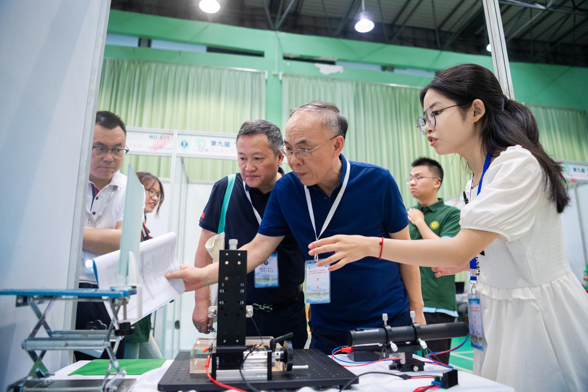 竞赛现场,学生对自主设计的物理实验进行演示。