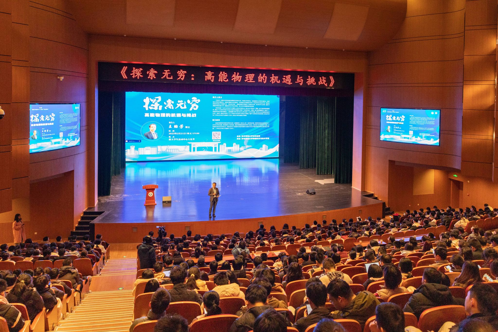 “基本粒子还能再分吗?”“粒子物理能解释宇宙学吗?”聚焦未来,王贻芳院士引出一系列问题,让青年学子了解粒子物理尚有长远道路,需要新一代继续深耕。“中国的科学在你们手上一定会走到世界前列。”王贻芳院士勉励在场师生,要拒绝平庸,树立远大志向,永葆对科学的热爱,对困难和挫折乐观,对课题与研究坚持。“要勇于挑战重大问题,不满足于有课题、有经费、有饭吃的‘舒适区’,要追求博古通今、超越前人,相信机遇并时刻准备着。”他的话语掷地有声,全场掌声雷动。