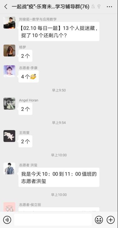 每天早上9:00开始,学习辅导群里就开始活跃起来,志愿者们实时在线为孩子提供学习辅导,帮助孩子们答疑解惑,并在群里进行“每日一题”知识小互动——每天涨点小知识。学习辅导志愿者廖衡越表示:“在线辅导是辰星支教协会的优势,我们从2016年就开始通过网络面向乡村中小学开展在校支教活动了,作为大学生,我非常希望能结合专业为疫情防控做一些力所能及事情,相信肺炎疫情很快就能过去。”其中一位参与志愿辅导活动的家长表示:“在疫情之下还能想着服务大家,非常感谢志愿者和工作人员们的付出!”