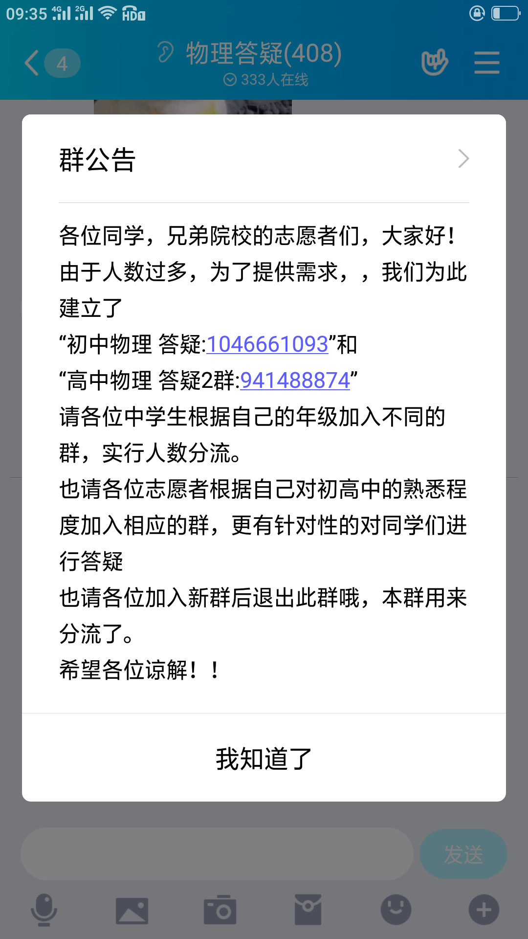 活动一经发起,便得到了华中师范大学与各大兄弟院校物理相关专业志愿者们的积极响应。截止到目前为止,已经建立四个答疑QQ群,分别为用来分流“物理答疑”以及三个用来答疑的“初中物理答疑”和“高中物理答疑”、“高中物理答疑2群”QQ群。群内汇聚了来自湖北、山东、广西、福建等20多个省市的近千余名学生与志愿者。