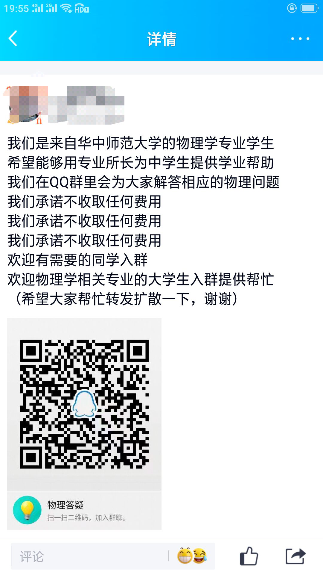 (通讯员:张晔)疫情无情人有情。202028日,物理科学与技术学院2016级物理师范专业的黄信安、周文同学发起QQ群线上答疑活动,该活动以辅导疫情严重的湖北省中学生物理学习为主,面向全国中学生,免费为同学们进行线上物理答疑。