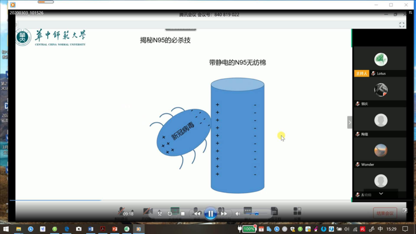 乔老师于本学期共开设3门课程,分别是:2018级本科生的《现代教育技术应用》、研究生的《信息技术于物理课程整合》以及《物理教学设计与案例分析》。受疫情影响只能进行网络授课,这对第一次开展网络教学的乔老师而言也是不小的挑战。授课之前,乔老师上网查找各网络直播平台的应用评价,综合比较选定网络教学平台,对于公式类的教学,则采用电脑外接摄像头的方式进行板书直播教学。为解决直播授课网络卡顿问题,方便学生进行课后复习,乔老师在上课时进行了全程录屏。因为准备工作十分充分,乔老师的网络课堂深受学生好评。此外,作为班主任的她,还积极组织学生开展班会活动,为学生讲述疫情期间如何高效地学习。