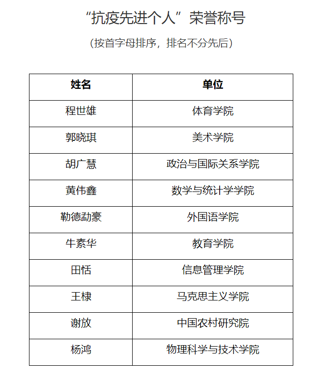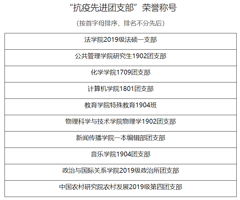 疫情期间,我校涌现出一批在抗“疫”工作中表现突出的先进个人和集体,校团委面向全校开展抗疫先进个人和抗疫先进团支部评选表彰工作,共评选出10名抗疫先进个人和10个抗疫先进团支部,我院研究生杨鸿、1902团支部获得此奖项。