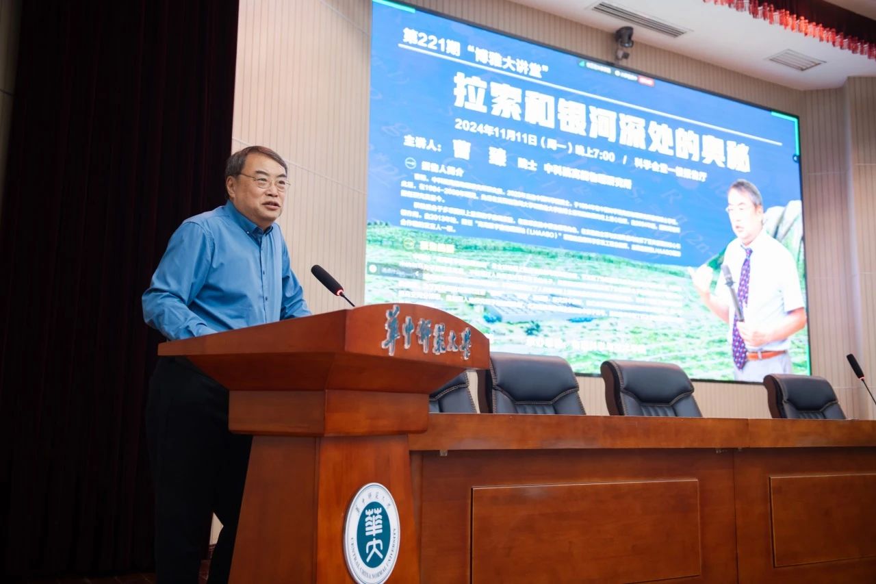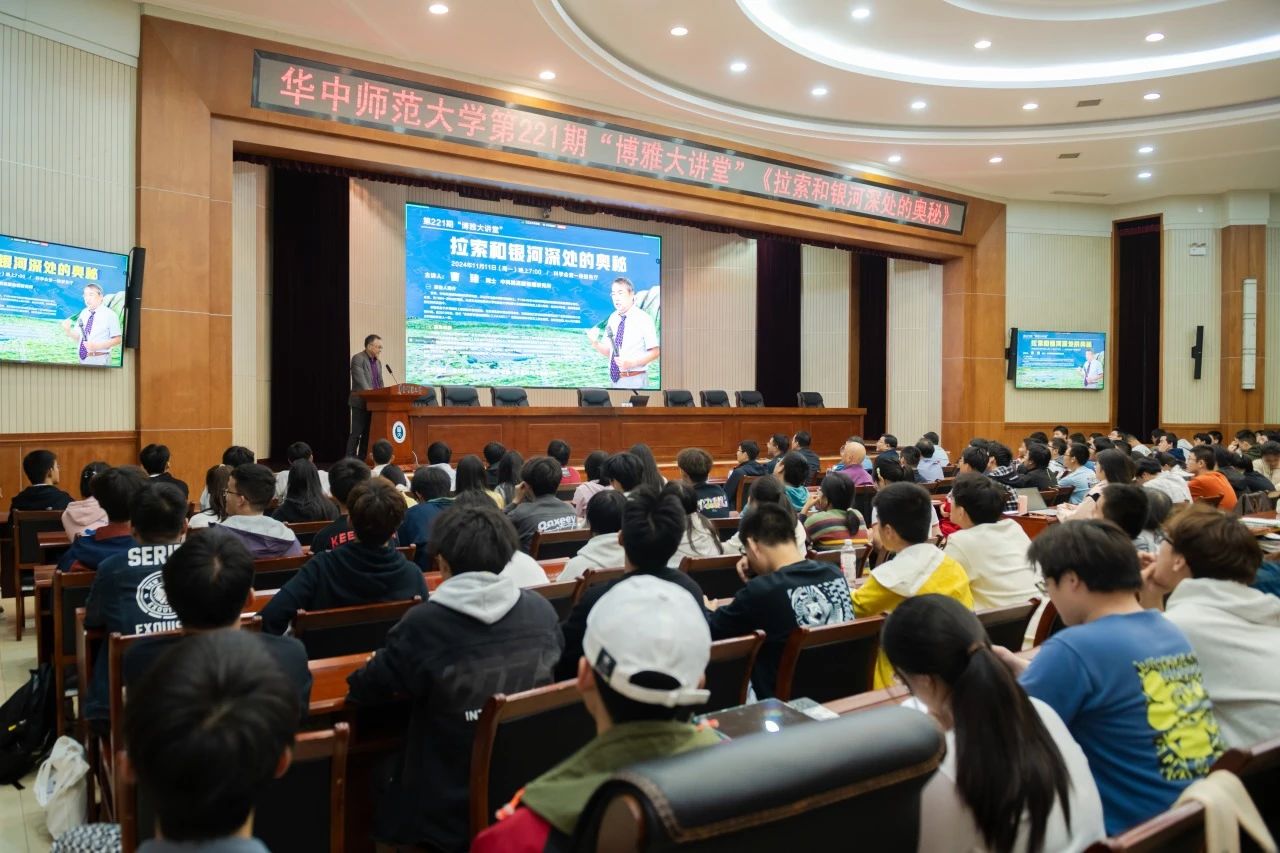 11月11日,中国科学院院士、中国科学院高能物理研究所研究员、“拉索”首席科学家曹臻院士作客华中师范大学第221期“博雅大讲堂”,在科学会堂一楼报告厅为我校师生带来“拉索和银河深处的奥秘”专题讲座。副校长刘宏达出席报告会并为曹臻院士颁发“博雅大讲堂”主讲人聘书。物理科学与技术学院师生四百余人到场聆听报告,本期大讲堂由王新年教授主持。
